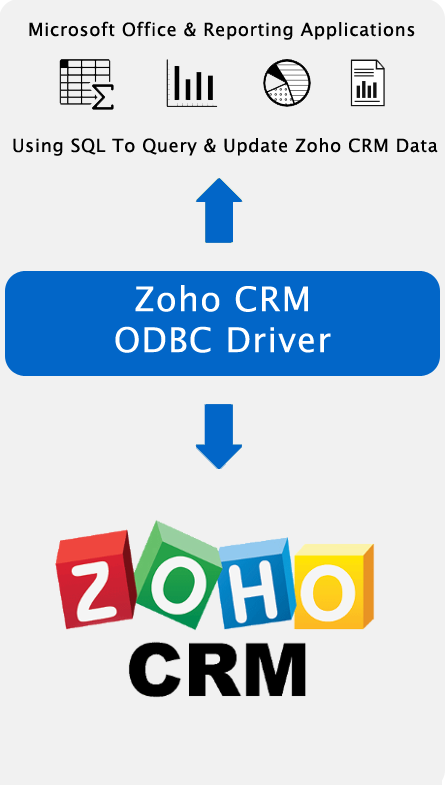 The Zoho CRM ODBC driver enables you to work with Zoho CRM data outside of the Zoho CRM web interface. The driver allows you to use Zoho CRM data in any application that supports ODBC. For example, Microsoft Access, Excel, Oracle, PHP, and Perl. You can query Zoho CRM as well as adding, updating, and deleting Zoho CRM records.